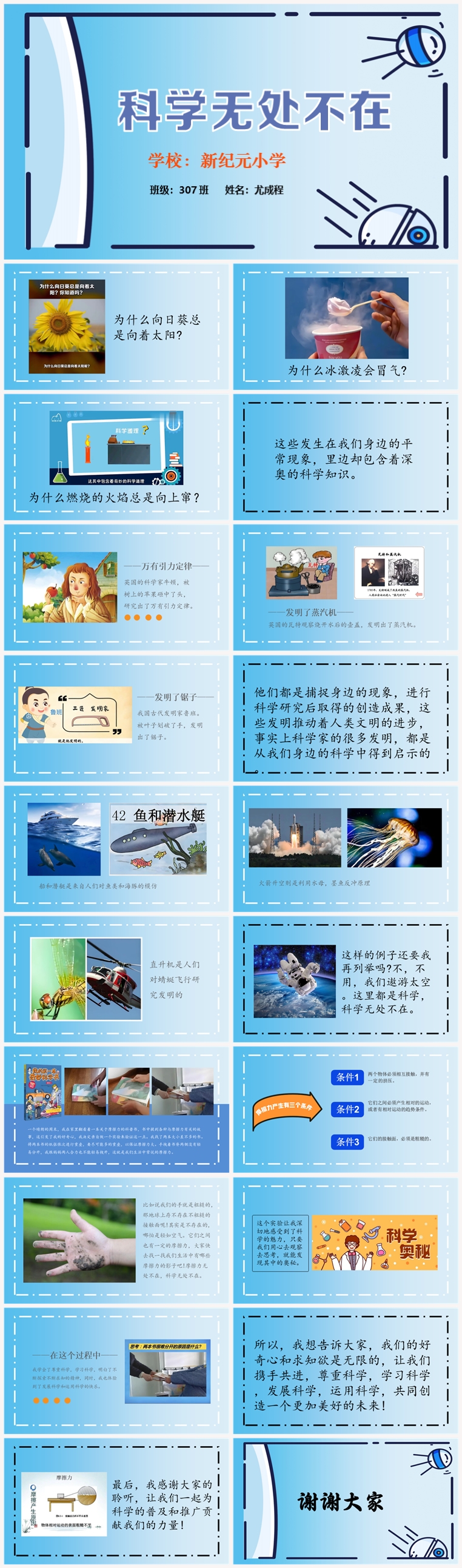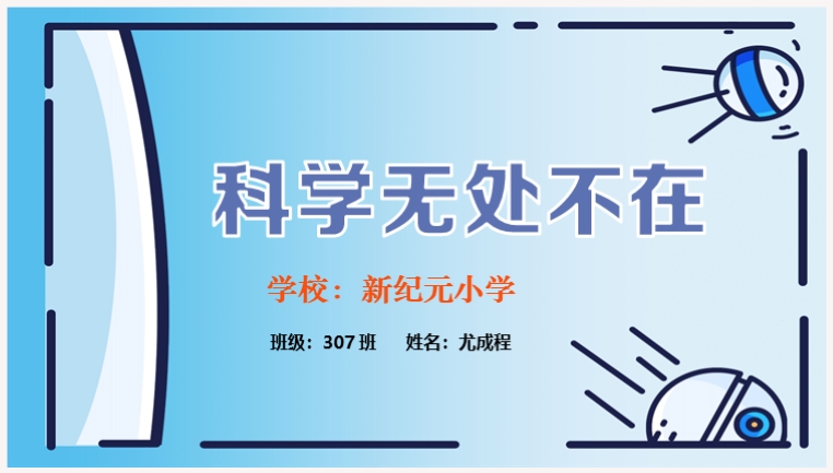 大家好,我来自新纪元小学307 班的尤成程,今天,我演讲的题目是科学无处不在。