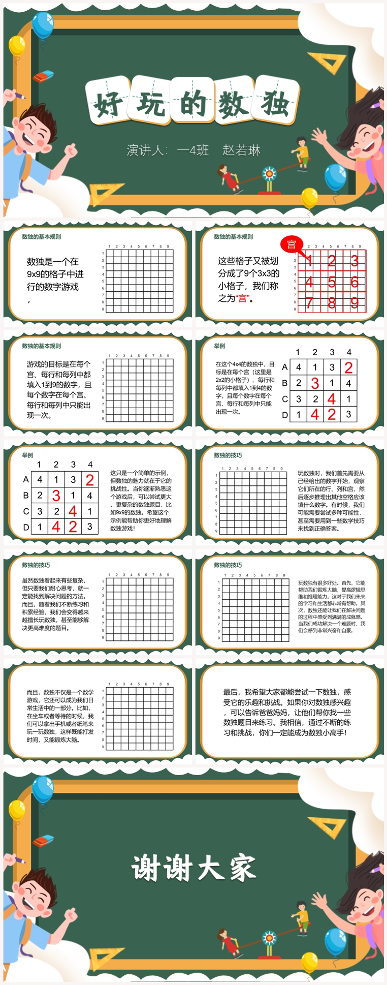 最后,我希望大家都能尝试一下数独,感受它的乐趣和挑战。如果你对数独感兴趣,可以告诉爸爸妈妈,让他们帮你找一些数独题目来练习。我相信,通过不断的练习和挑战,你们一定能成为数独小高手!