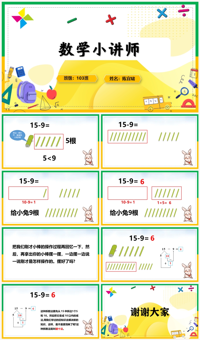 一捆 10 根、和5 根.这是 15 根小棒,现在想要拿给小兔9根。散的只有5根,5比9小,不够给,怎么办呢?对了,我们可以帮老板把这一捆打开,直接拿给小免9根就可以了,想一想,为什么要把这-捆打开呢?打开一捆,一个十就变成了 10个一。再从 10 个一里面拿给小兔子9个一就可以了。10-9,还剩下几?对10-9=1,再把这剩下的1根小棒和前面散的5根合起来,再算5+1=6。就是剩下的6根小棒。(先算 10-9=1 再算 1+5=6 板书)这样也能算出 15-9=6.按照同学们这种给法,我们只需要给1次,小兔就拿到了9支铅笔,仔细看(给次,算两次,先减后加。板书)