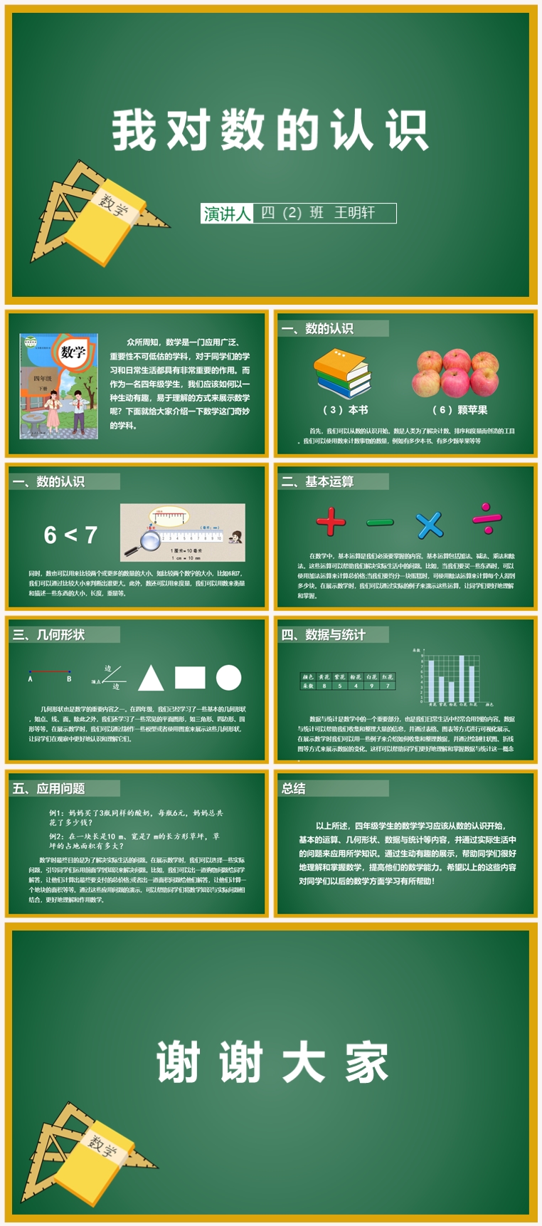 以上所述,四年级学生的数学学习应该从数的认识开始,基本的运算、几何形状、数据与统计等内容,并通过实际生活中的问题来应用所学知识。通过生动有趣的展示,帮助同学们很好地理解和掌握数学,提高他们的数学能力。希望以上的这些内容对同学们以后的数学方面学习有所帮助!———— 我的演讲完毕,谢谢大家!