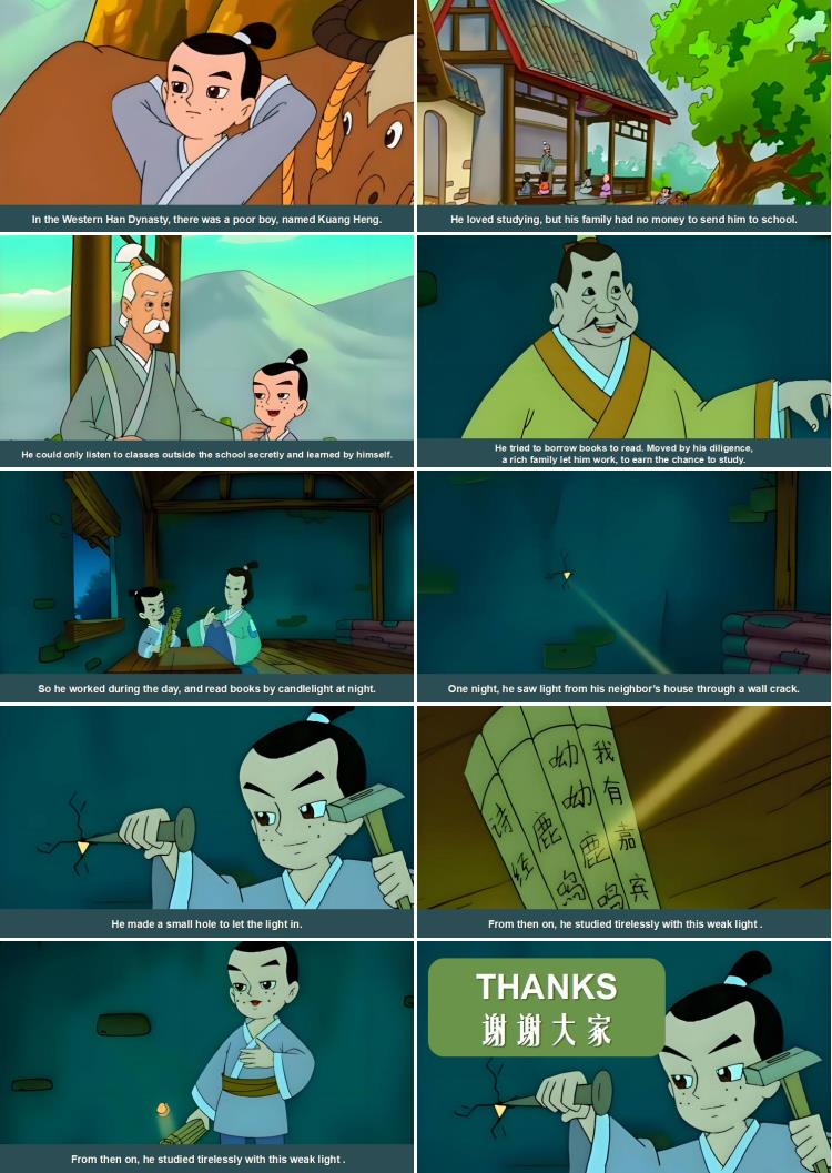 在西汉时期,有一个贫穷的男孩名叫匡衡。他热爱学习,但他的家庭没有钱供他上学。他只能偷偷地在学校外面听课,并自学。他尝试借书来阅读。一家富贵人家被他的勤奋所感动,便让他做工,以换取学习的机会。于是,他白天做工,晚上则在烛光下读书。有一天晚上,他看到邻居家的光线透过墙壁的裂缝照了进来。他便凿了一个小洞,让光线透进来。从那以后,他就借着这微弱的光线,孜孜不倦地学习。这个故事告诉我们永远不要放弃学习!