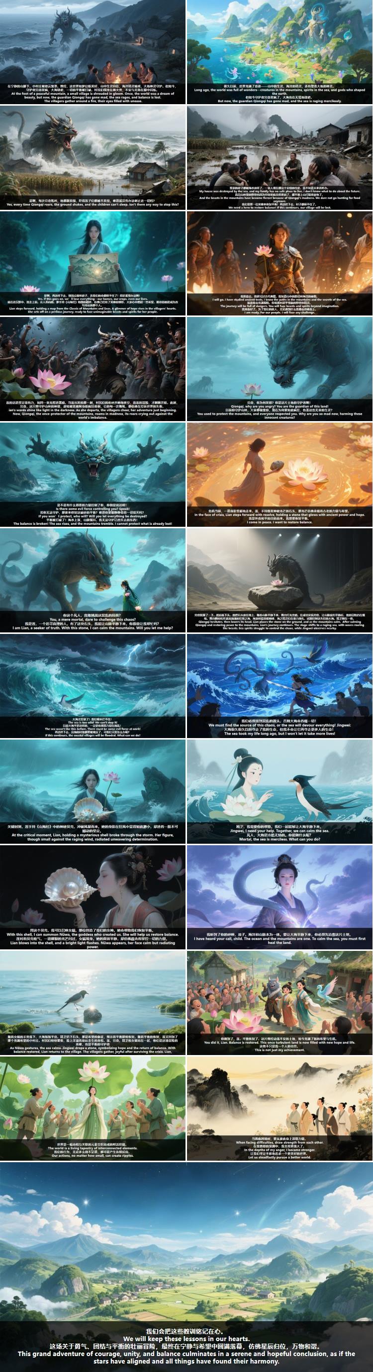 随着女娲的手势落下,大海渐渐平息。精卫扔下石头,那是希望的象征,预示着平衡即将恢复。随着平衡的恢复,莲又回到了那个充满希望的小村庄。村民们纷纷聚集,脸上洋溢着劫后余生的喜悦。莲、穷奇、精卫和女娲站在一起,他们是这场冒险的英雄,也是平衡的守护者