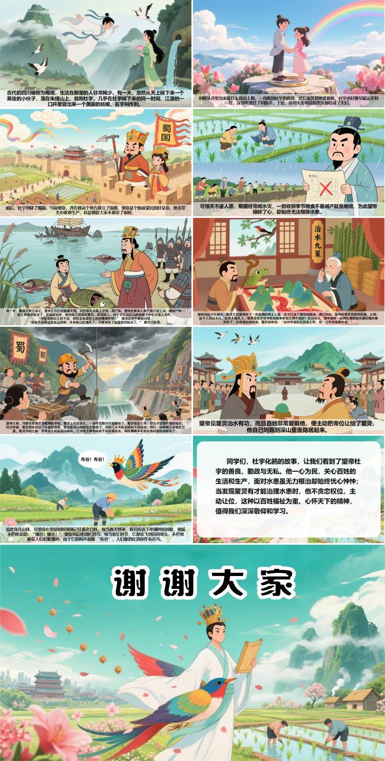 同学们,杜宇化鹃的故事,让我们看到了望帝杜宇的善良、勤政与无私。他一心为民,关心百姓的生活和生产,面对水患虽无力根治却始终忧心忡忡;当发现鳖灵有才能治理水患时,他不贪恋权位,主动让位,这种以百姓福祉为重、心怀天下的精神,值得我们深深敬仰和学习。