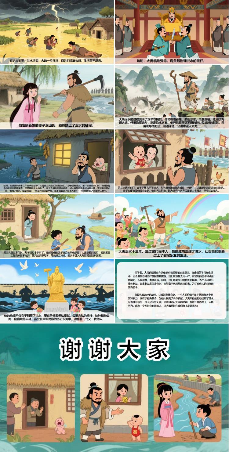同学们,大禹的精神在今天依然有着重要的启示意义。在我们的学习和生活中,也会遇到各种各样的困难和挑战,我们应该像大禹一样,有坚定的信念和顽强的毅力,不畏艰难,勇往直前。同时,我们也要学习他的无私精神,当个人利益与集体利益、国家利益发生冲突时,能够毫不犹豫地选择后者,为了更伟大的目标而努力奋斗。