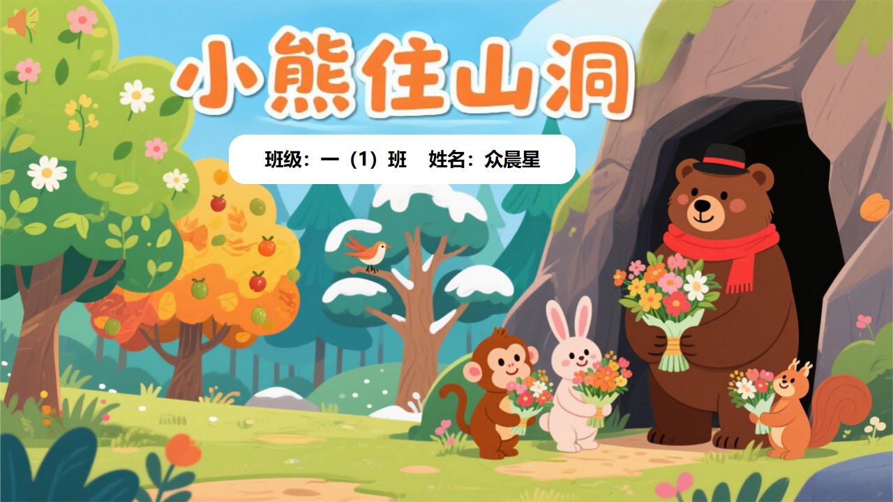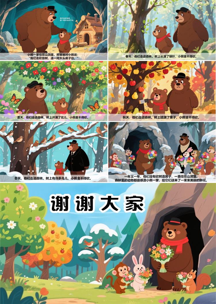 一年又一年,他们没有砍树造房子,一直住在山洞里。森林里的动物都很感激小熊一家,给它们送来了一束束美丽的鲜花。