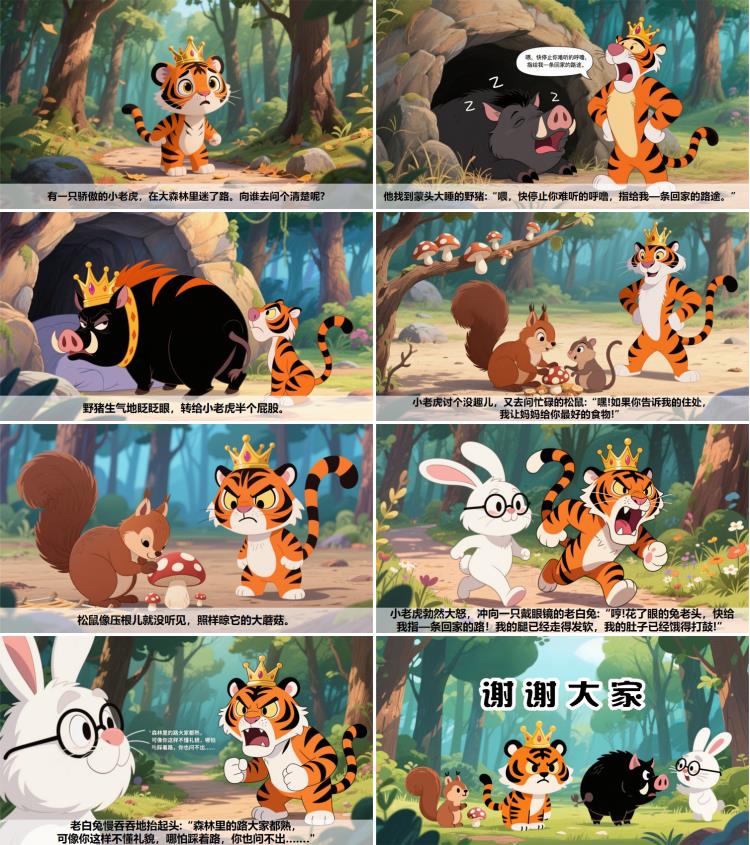松鼠像压根儿就没听见,照样晾它的大蘑菇。小老虎勃然大怒,冲向一只戴眼镜的老白兔:“哼!花了眼的兔老头,快给我指—条回家的路!我的腿已经走得发软,我的肚子已经饿得打鼓!”老白兔慢吞吞地抬起头:“森林里的路大家都熟,可像你这样不懂礼貌,哪怕踩着路,你也问不出….…"