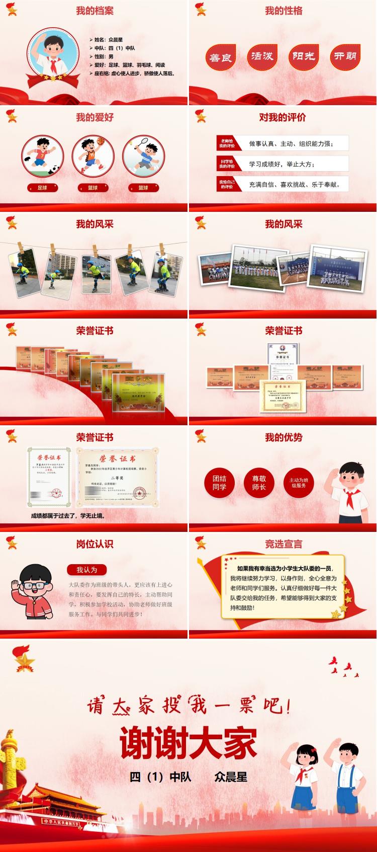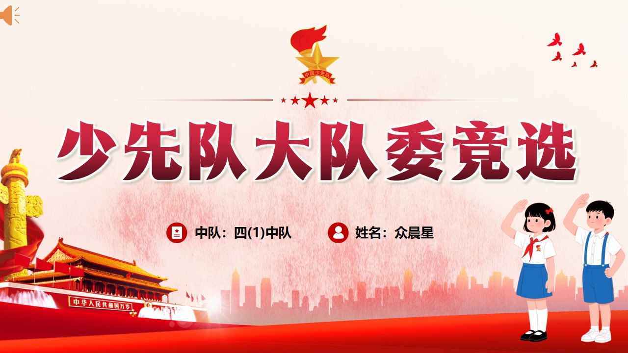 我是四一中队的的众晨星,今天非常荣幸能够站在这里,参加大队委员的竞选活动。我平时喜欢足球、篮球、羽毛球、阅读。我的座右铭是:虚心使人进步,骄傲使人落后。