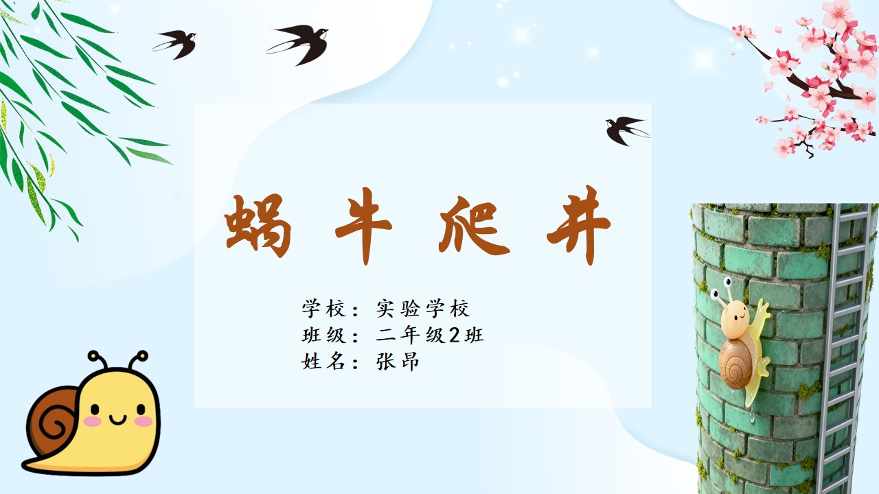 亲爱的老师、同学们,大家好!我是来自实验学校二年级2班的张昂。今天我要带大家解锁一个“数学+科学”的双重谜题——蜗牛爬井!这只不服输的小蜗牛,不仅藏着数学计算的小技巧,还有超有趣的科学小知识,咱们一起探秘吧~