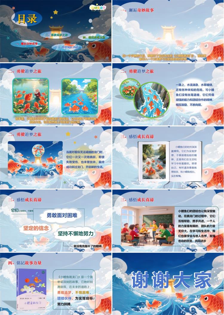 《小鲤鱼跳龙门》是一个简单却深刻的故事,它将时刻激励我,在未来的道路上,勇敢追梦,不惧困难,团结伙伴,为实现目标努力拼搏。