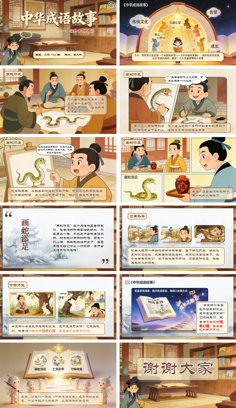 小朋友们,你们看,这个故事是不是很有趣?其实,“画蛇添足”这个成语就是告诉我们,做事情的时候要恰到好处,不要多此一举,不然反而会把事情办坏。就像我们画画的时候,画完一只小猫,本来已经很可爱了,要是再随便给它添上一对翅膀,反而会变得不伦不类啦!