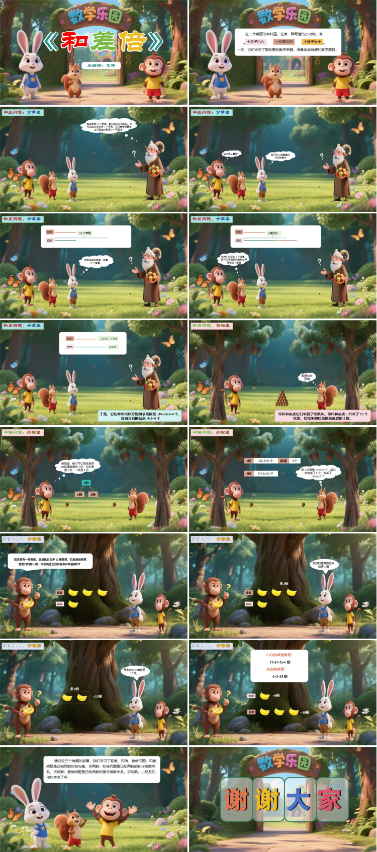 二、和倍问题:采松果松松和皮皮它们来到了松果林。松松和皮皮一共采了 15 个松果,松松采的松果数是皮皮的 2 倍。这次,皮皮主动说:"我知道,可以我采的松果数看作 1 份,松松就是 2 份,一共是 3 份。" 松松接着说:" 那 1 份就是 15÷3=5 个,所以皮皮采了 5 个,我采了 5×2=10 个。" 三、差倍问题:分香蕉 最后,它们遇到了猴妈妈。猴妈妈说:"我这里有一些香蕉,皮皮比白白多 12 根香蕉,且皮皮的香蕉数是白白的 3 倍,你们知道它们各有多少根香蕉吗?" 白白想了想说:"皮皮的香蕉数比白白多 2 倍,而多的这 2 倍就是 12 根。" 所以,白白的香蕉数是 12÷(3−1)=6 根,皮皮的就是 6×3=18 根。