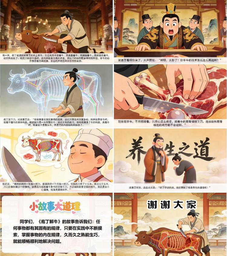 梁惠王看得惊呆了,大声赞叹:“啊呀,太妙了!你宰牛的技术怎么这么高超啊?”