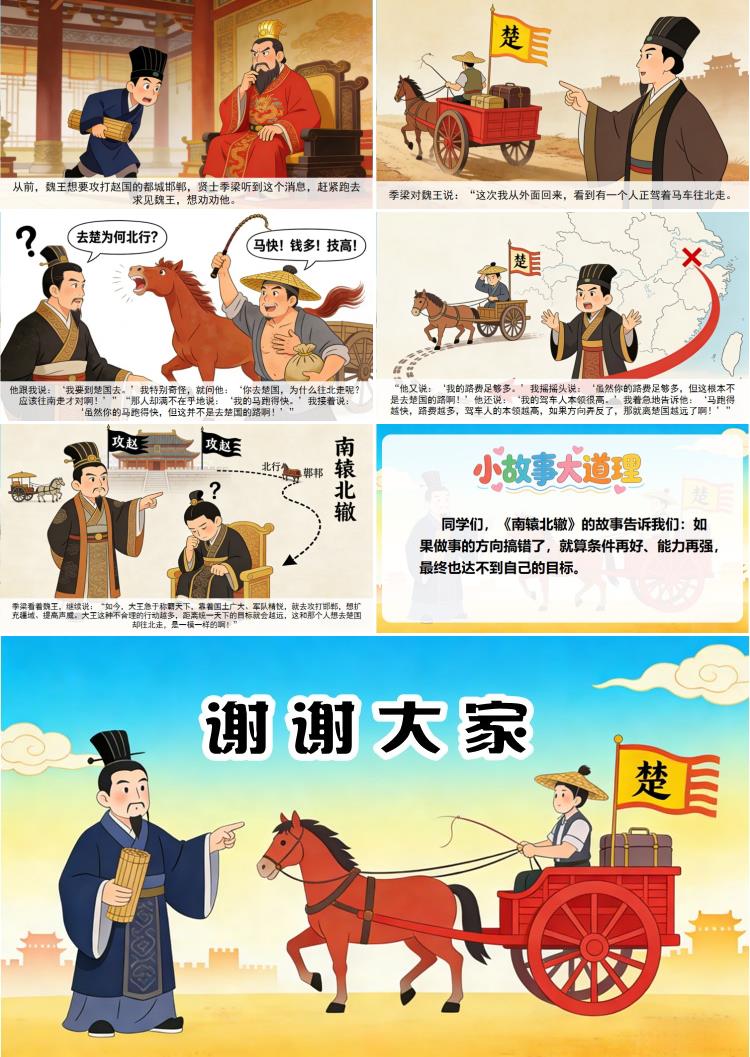 同学们,《南辕北辙》的故事告诉我们:如果做事的方向搞错了,就算条件再好、能力再强,最终也达不到自己的目标。