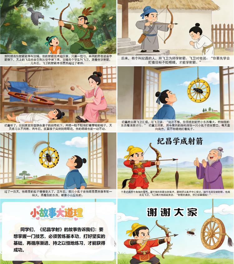 同学们,《纪昌学射》的故事告诉我们:要想掌握一门技艺,必须苦练基本功,打好坚实的基础,再循序渐进、持之以恒地练习,才能获得成功。