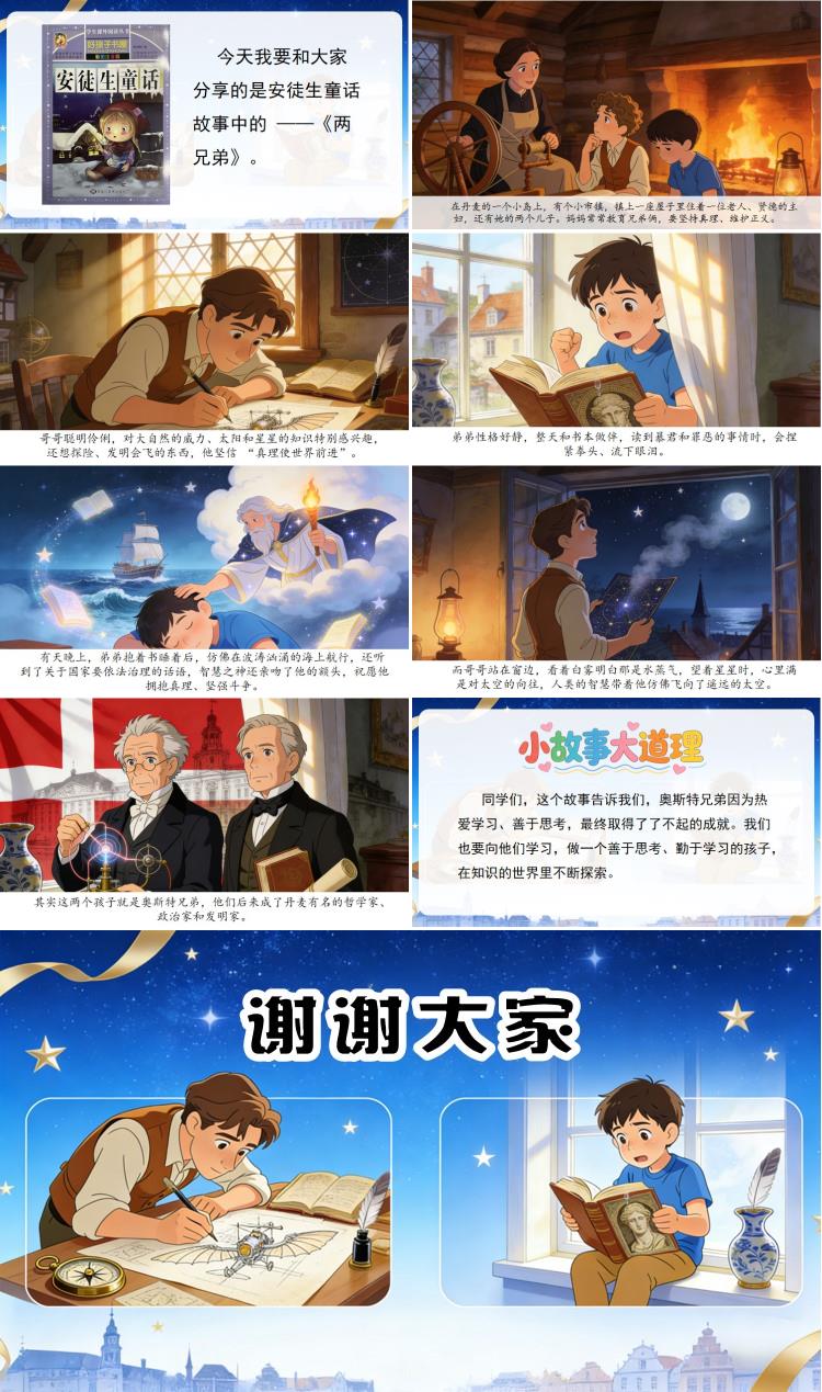 同学们,这个故事告诉我们,奥斯特兄弟因为热爱学习、善于思考,最终取得了了不起的成就。我们也要向他们学习,做一个善于思考、勤于学习的孩子,在知识的世界里不断探索。