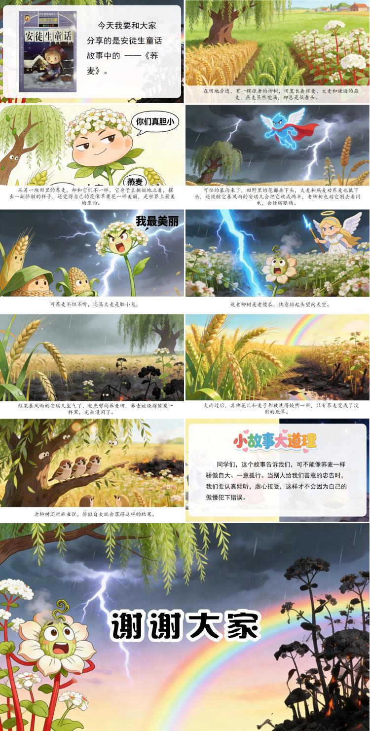 同学们,这个故事告诉我们,可不能像荞麦一样骄傲自大、一意孤行。当别人给我们善意的忠告时,我们要认真倾听,虚心接受,这样才不会因为自己的傲慢犯下错误。