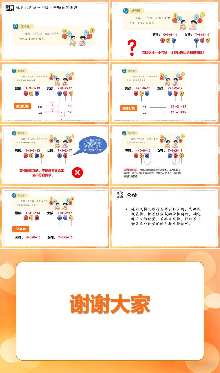 总结方法:遇到交换气球这类移多补少题,先画图找差值,把差值分成两份相同的,确定补给少的数量;若要求交换,找相差正好是这个数量的两个数交换即可。
