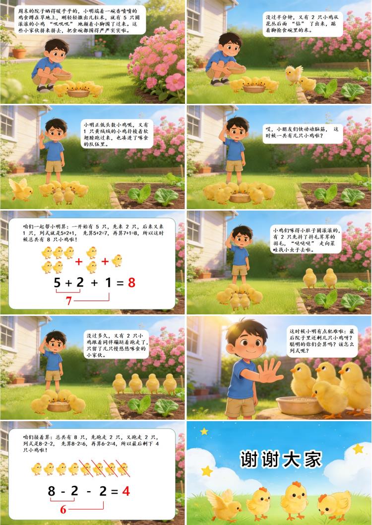 咱们一起帮小明算:一开始有 5 只,先来 2 只,后来又来 1 只,列式就是5+2+1, 先算5+2=7,再算7+1=8,所以这时候总共有 8 只小鸡啦!