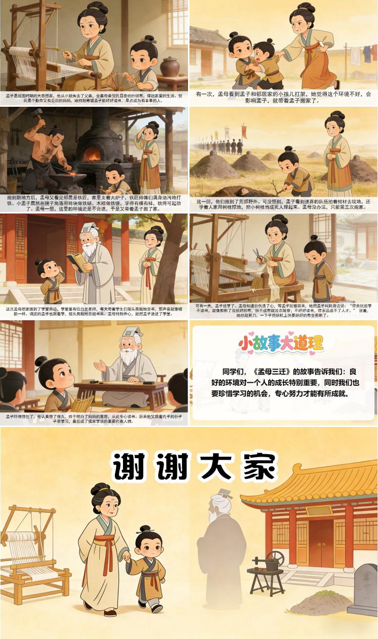 同学们,《孟母三迁》的故事告诉我们:良好的环境对一个人的成长特别重要,同时我们也要珍惜学习的机会,专心努力才能有所成就。