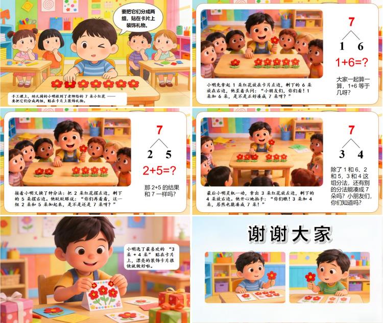 小明先拿起 1 朵红花放在卡片左边,剩下的 6 朵放在右边,他歪着头问:“小朋友们,你们看!1 朵加 6 朵,是不是正好凑成 7 朵呀?”