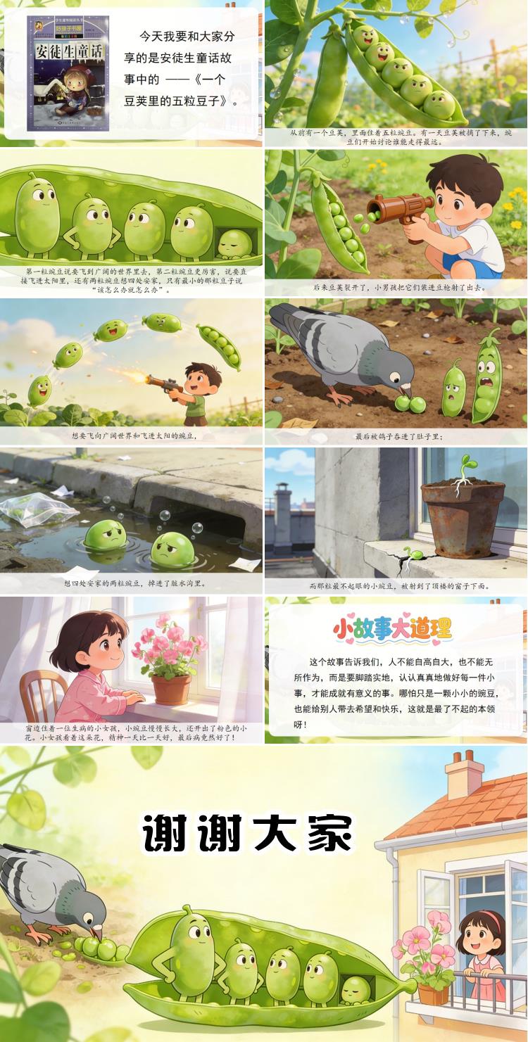 大家好,我是三年级一班的众晨星,今天我要和大家分享的是安徒生童话故事中的 ——《一个豆荚里的五粒豆子》。