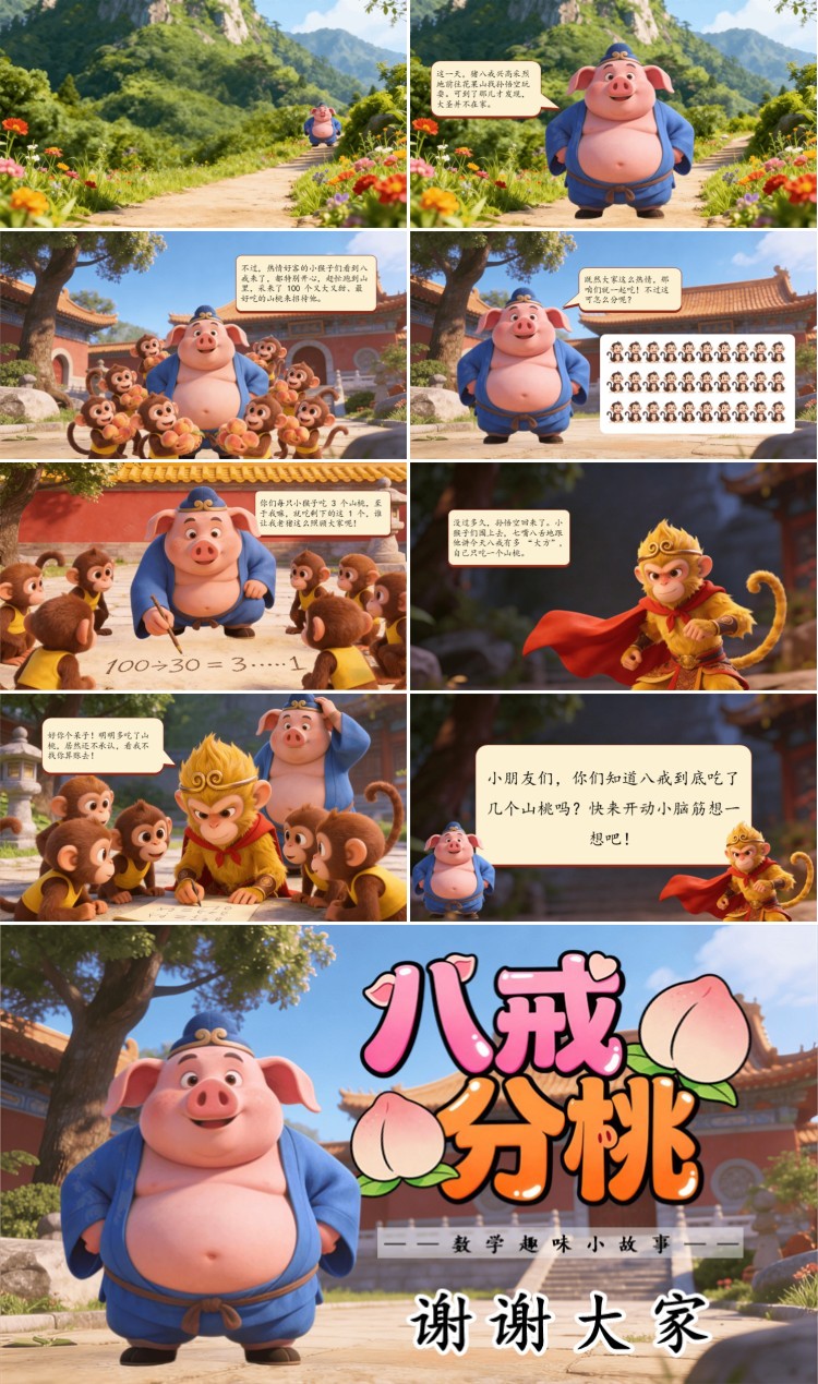 这一天,猪八戒兴高采烈地前往花果山找孙悟空玩耍。可到了那儿才发现,大圣并不在家。不过,热情好客的小猴子们看到八戒来了,都特别开心,赶忙跑到山里,采来了 100 个又大又甜、最好吃的山桃来招待他。