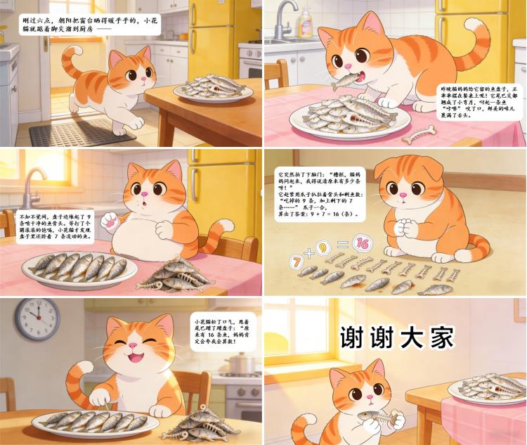 小花猫松了口气,甩着尾巴蹭了蹭盘子:“原来有 16 条鱼,妈妈肯定会夸我会算数!