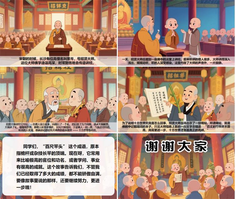 同学们,“百尺竿头” 这个成语,原本指桅杆或杂技长竿的顶端。现在呀,它常用来比喻极高的官位和功名,或者学问、事业有很高的成就。这个故事告诉我们,不管我们已经取得了多大的成绩,都不能骄傲自满,要像故事里说的那样,还要继续努力,更进一步哦!
