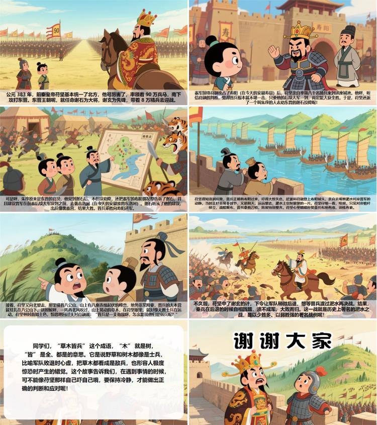 同学们,“草木皆兵” 这个成语,“木” 就是树,“皆” 是全、都是的意思。它是说野草和树木都像是士兵,比喻军队败退时心虚,把草木都看成是敌兵,也形容人极度惊恐时产生的错觉。这个故事告诉我们,在遇到事情的时候,可不能像苻坚那样自己吓自己哦,要保持冷静,才能做出正确的判断和应对呢!