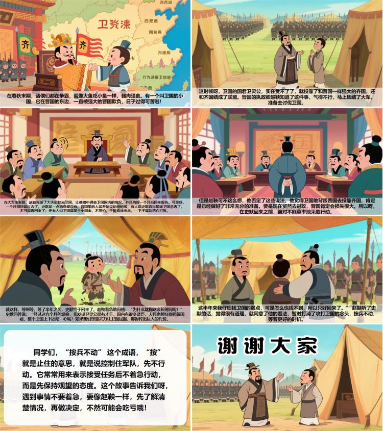 同学们,“按兵不动” 这个成语,“按” 就是止住的意思,就是说控制住军队,先不行动。它常常用来表示接受任务后不着急行动,而是先保持观望的态度。这个故事告诉我们呀,遇到事情不要着急,要像赵鞅一样,先了解清楚情况,再做决定,不然可能会吃亏哦!