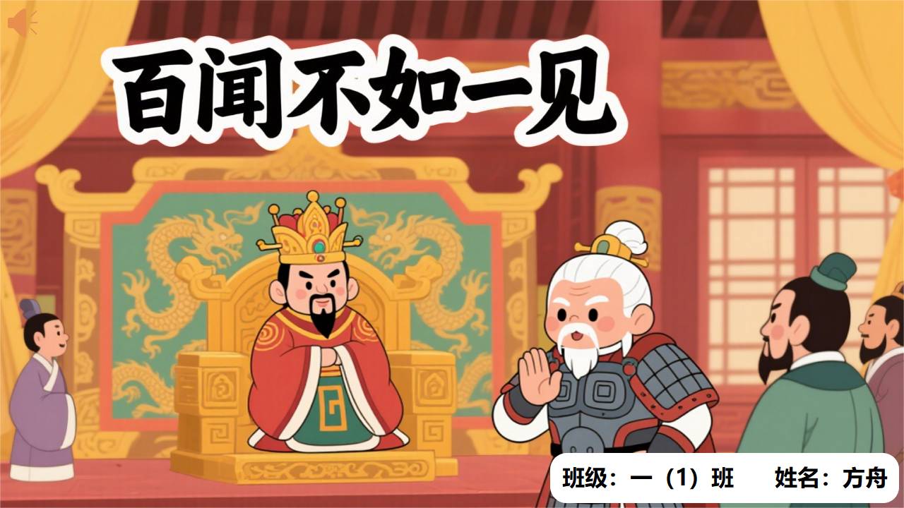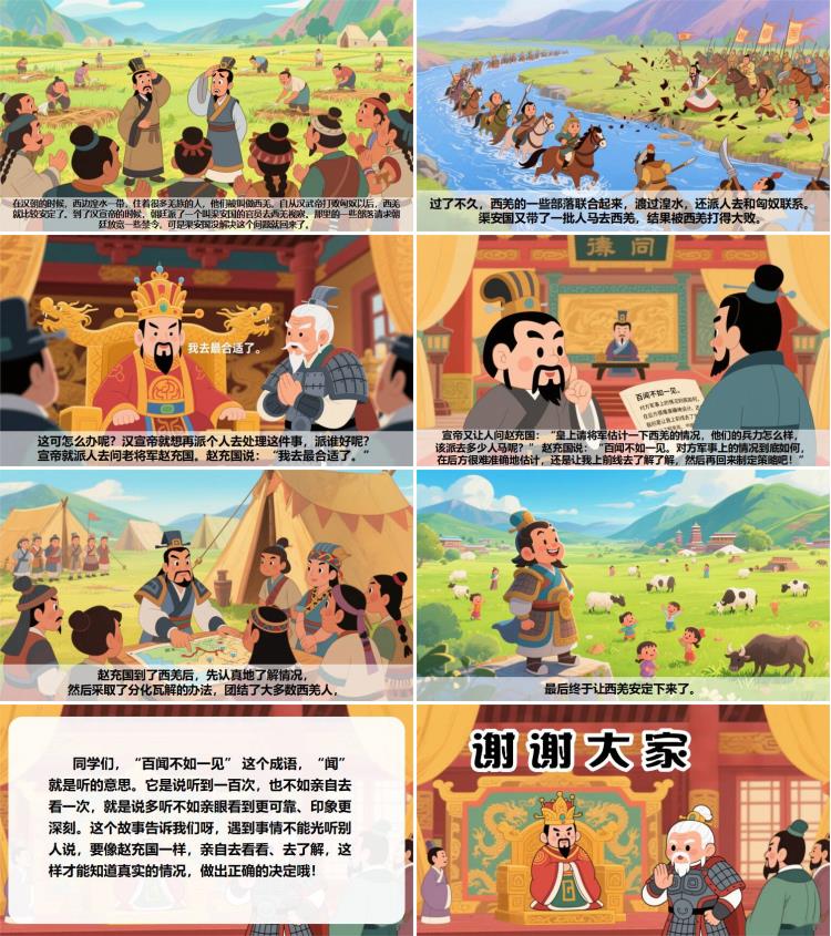 同学们,“百闻不如一见” 这个成语,“闻” 就是听的意思。它是说听到一百次,也不如亲自去看一次,就是说多听不如亲眼看到更可靠、印象更深刻。这个故事告诉我们呀,遇到事情不能光听别人说,要像赵充国一样,亲自去看看、去了解,这样才能知道真实的情况,做出正确的决定哦!