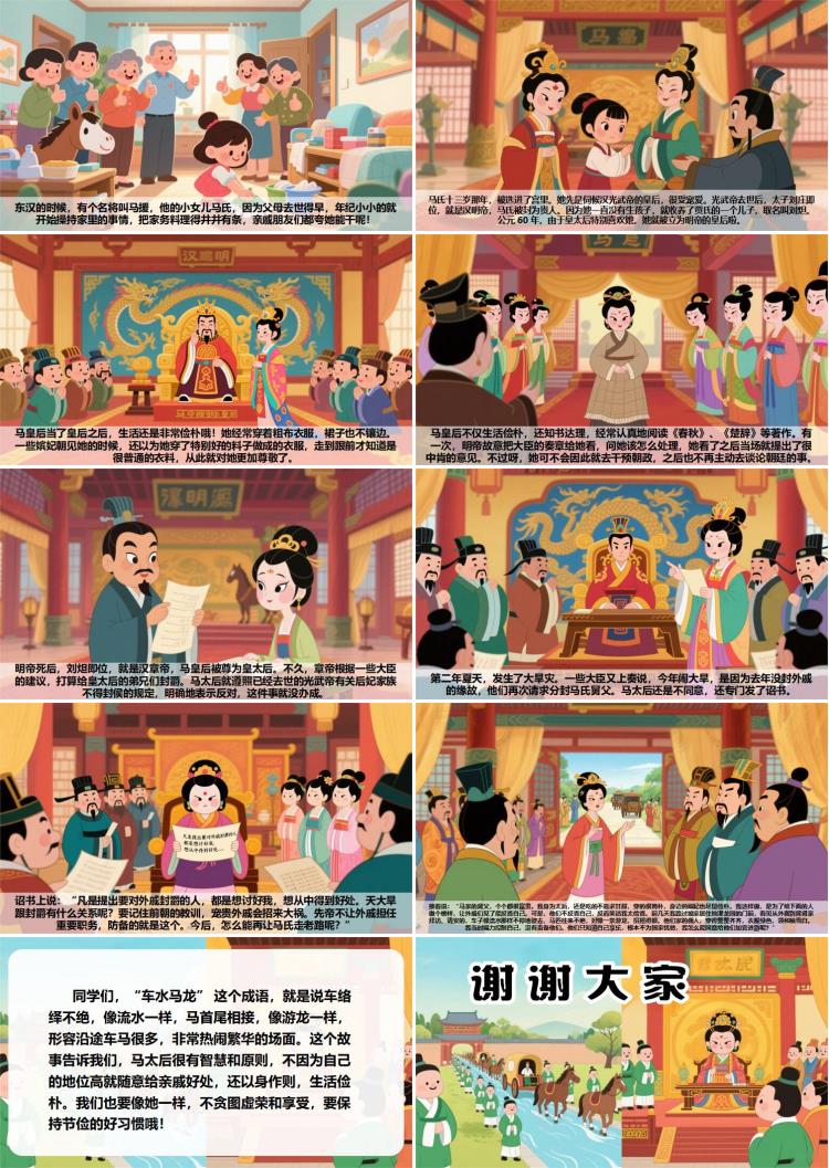 同学们,“车水马龙” 这个成语,就是说车络绎不绝,像流水一样,马首尾相接,像游龙一样,形容沿途车马很多,非常热闹繁华的场面。这个故事告诉我们,马太后很有智慧和原则,不因为自己的地位高就随意给亲戚好处,还以身作则,生活俭朴。我们也要像她一样,不贪图虚荣和享受,要保持节俭的好习惯哦!