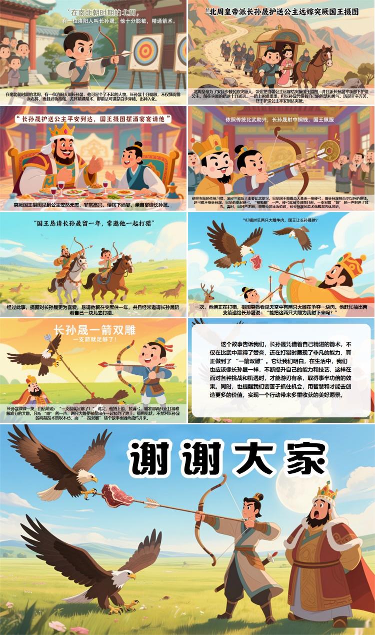 这个故事告诉我们,长孙晟凭借着自己精湛的箭术,不仅在比武中赢得了赞誉,还在打猎时展现了非凡的能力,真正做到了 “一箭双雕”。它让我们明白,在生活中,我们也应该像长孙晟一样,不断提升自己的能力和技艺,这样在面对各种挑战和机遇时,才能游刃有余,取得事半功倍的效果。同时,也提醒我们要善于抓住机会,用智慧和才能去创造更多的价值,实现一个行动带来多重收获的美好愿景。