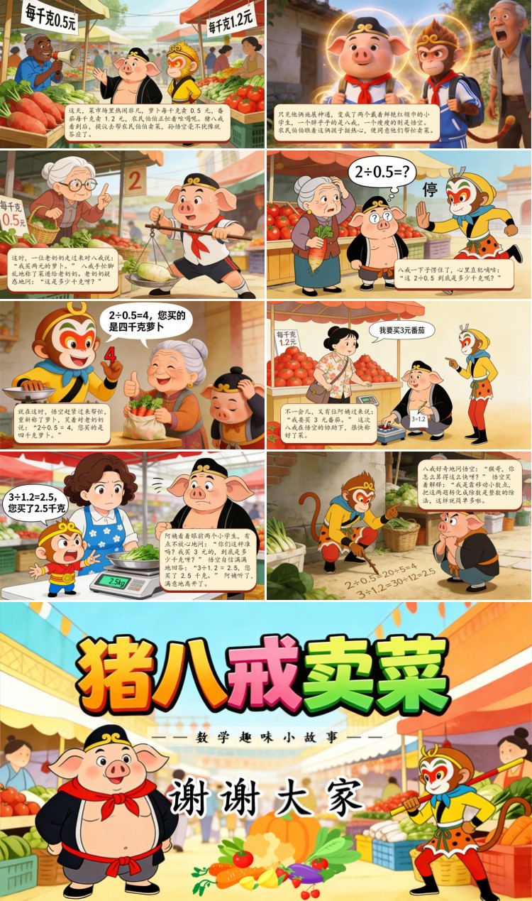 这时,一位老奶奶走过来对八戒说:“我买两元的萝卜。” 八戒手忙脚乱地称了菜递给老奶奶。老奶奶疑惑地问:“这是多少千克呀?” 八戒一下子愣住了,心里直犯嘀咕:“这 2÷0.5 到底是多少千克呢?” 就在这时,悟空赶紧过来帮忙,重新称了萝卜,笑着对老奶奶说:“2÷0.5 = 4,您买的是四千克萝卜。”