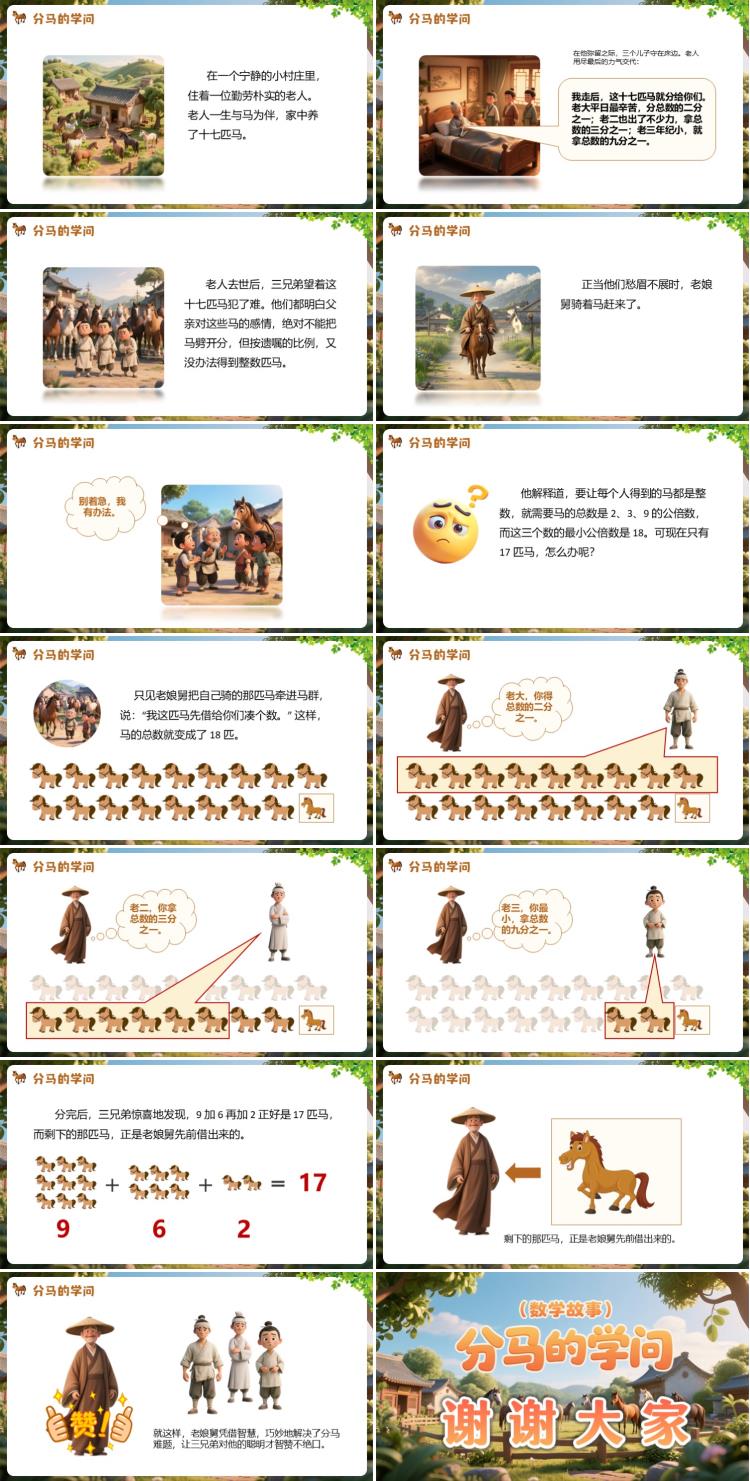 在一个宁静的小村庄里,住着一位勤劳朴实的老人。老人一生与马为伴,家中养了十七匹马。在他弥留之际,三个儿子守在床边。老人用尽最后的力气交代:“我走后,这十七匹马就分给你们。老大平日最辛苦,分总数的二分之一;老二也出了不少力,拿总数的三分之一;老三年纪小,就拿总数的九分之一。” 说完,老人便安详地离开了人世。