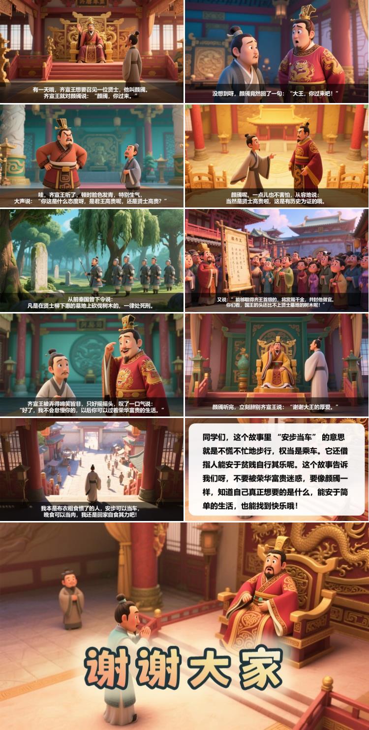 同学们,这个故事里 “安步当车” 的意思就是不慌不忙地步行,权当是乘车。它还借指人能安于贫贱自行其乐呢。这个故事告诉我们呀,不要被荣华富贵迷惑,要像颜斶一样,知道自己真正想要的是什么,能安于简单的生活,也能找到快乐哦!