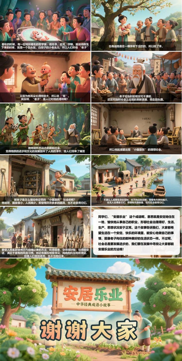 同学们,“安居乐业” 这个成语呢,意思就是安定地住在一地,愉快地从事自己的职业,形容社会治理得好,生活、生产、思想状况安于正常。这个故事告诉我们,大家都希望生活在一个安定、快乐的环境里,能安心地做自己的事情,就像老子向往的那种美好的生活状态一样。不过呢,社会总是要发展进步的,我们要在发展中寻找让大家都能安居乐业的方法哦!