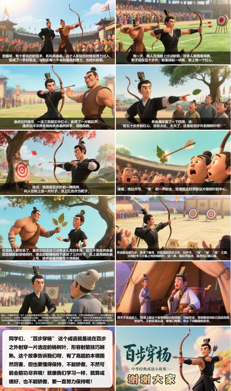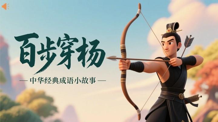 同学们,“百步穿杨” 这个成语就是说在百步之外射穿一片选定的杨树叶,形容射箭技巧娴熟。这个故事告诉我们呀,有了高超的本领固然厉害,但也要懂得保持,不能骄傲,不然可能会前功尽弃哦!就像我们学习一样,就算成绩好,也不能骄傲,要一直努力保持呢!