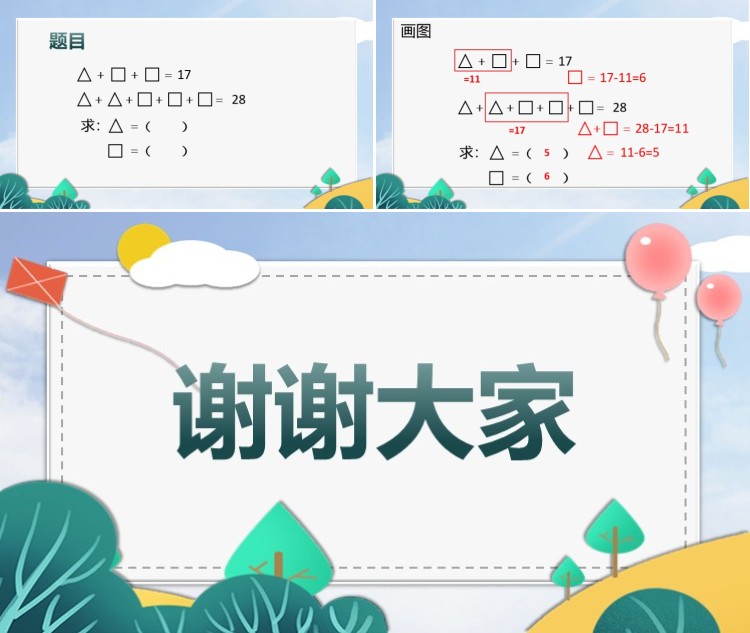 那三角形呢?因为我们知道三角形 + 正方形 = 11,正方形是 6,所以三角形就是 “11 - 6 = 5”,最终我们算出正方形代表 5,三角形代表 6。