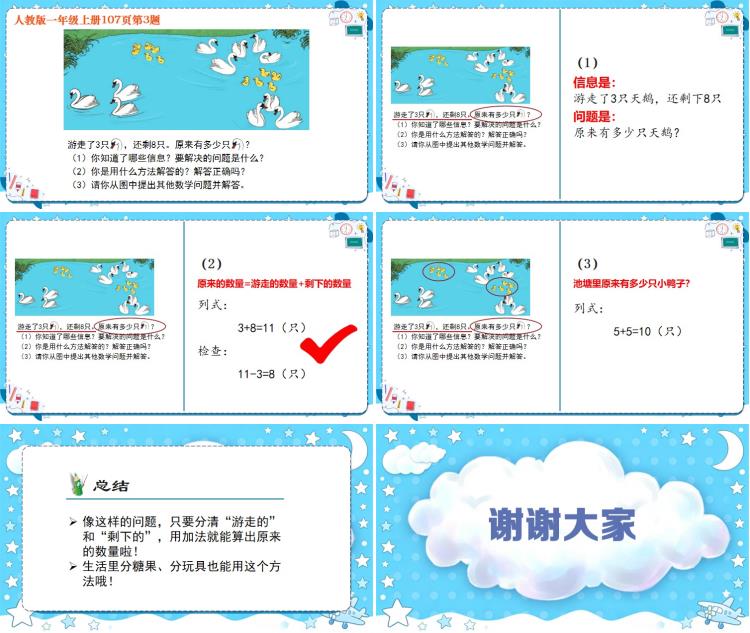我们来找信息和问题,首先看题目,我们知道的信息是:游走了3只天鹅,还剩下8只。要解决的问题是“原来有多少只天鹅?”
