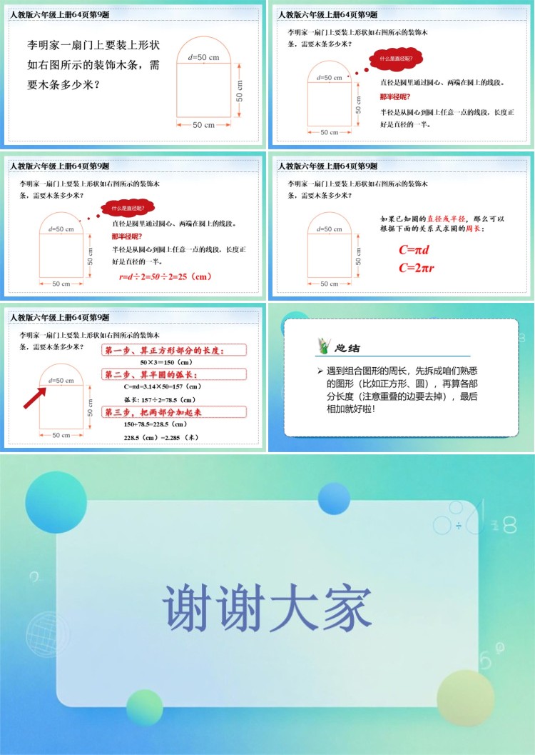 总结一下方法:遇到组合图形的周长,先拆成咱们熟悉的图形(比如正方形、圆),再算各部分长度(注意重叠的边要去掉),最后相加就好啦!