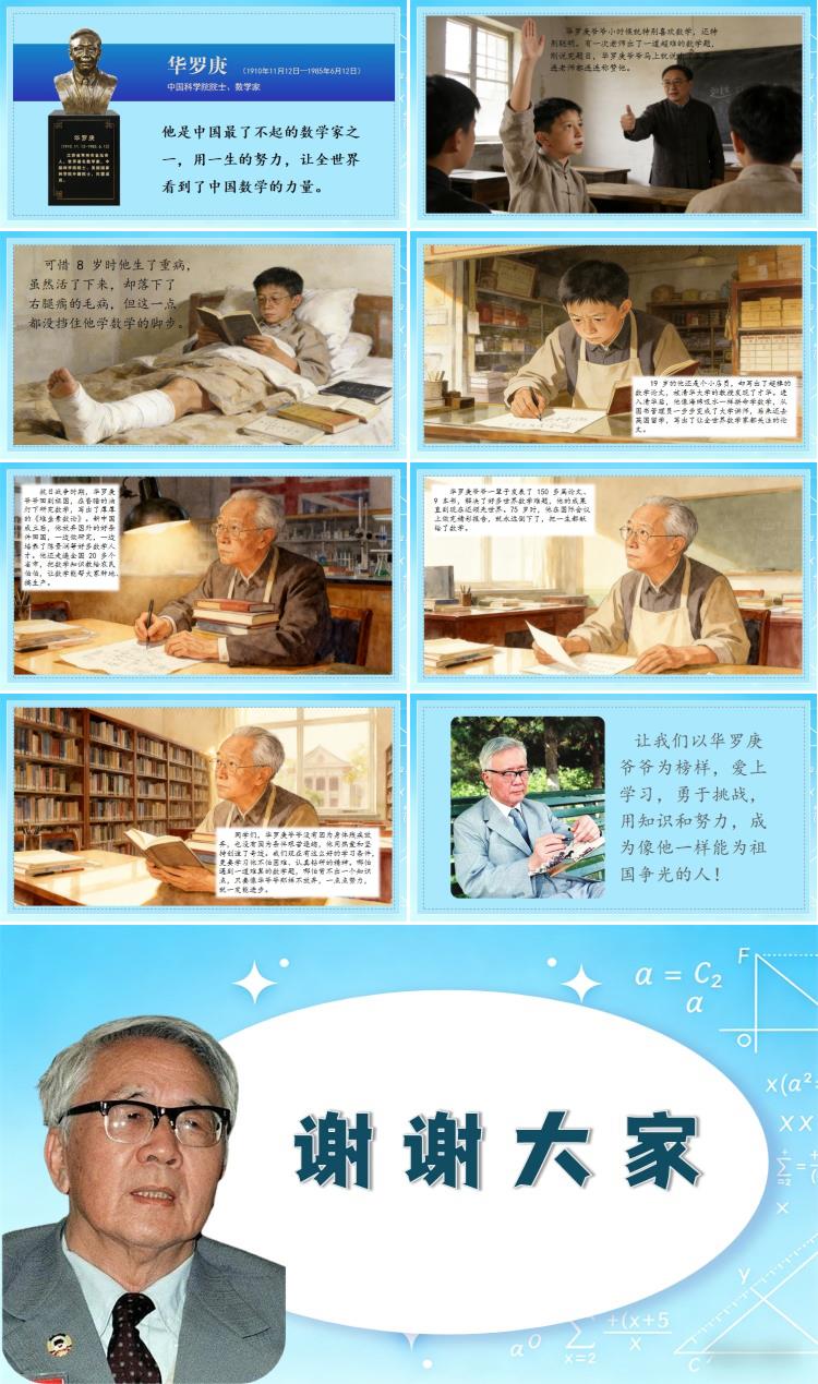 同学们,华罗庚爷爷没有因为身体残疾放弃,也没有因为条件艰苦退缩,他用热爱和坚持创造了奇迹。我们现在有这么好的学习条件,更要学习他不怕困难、认真钻研的精神。哪怕遇到一道难算的数学题,哪怕背不出一个知识点,只要像华爷爷那样不放弃,一点点努力,就一定能进步。