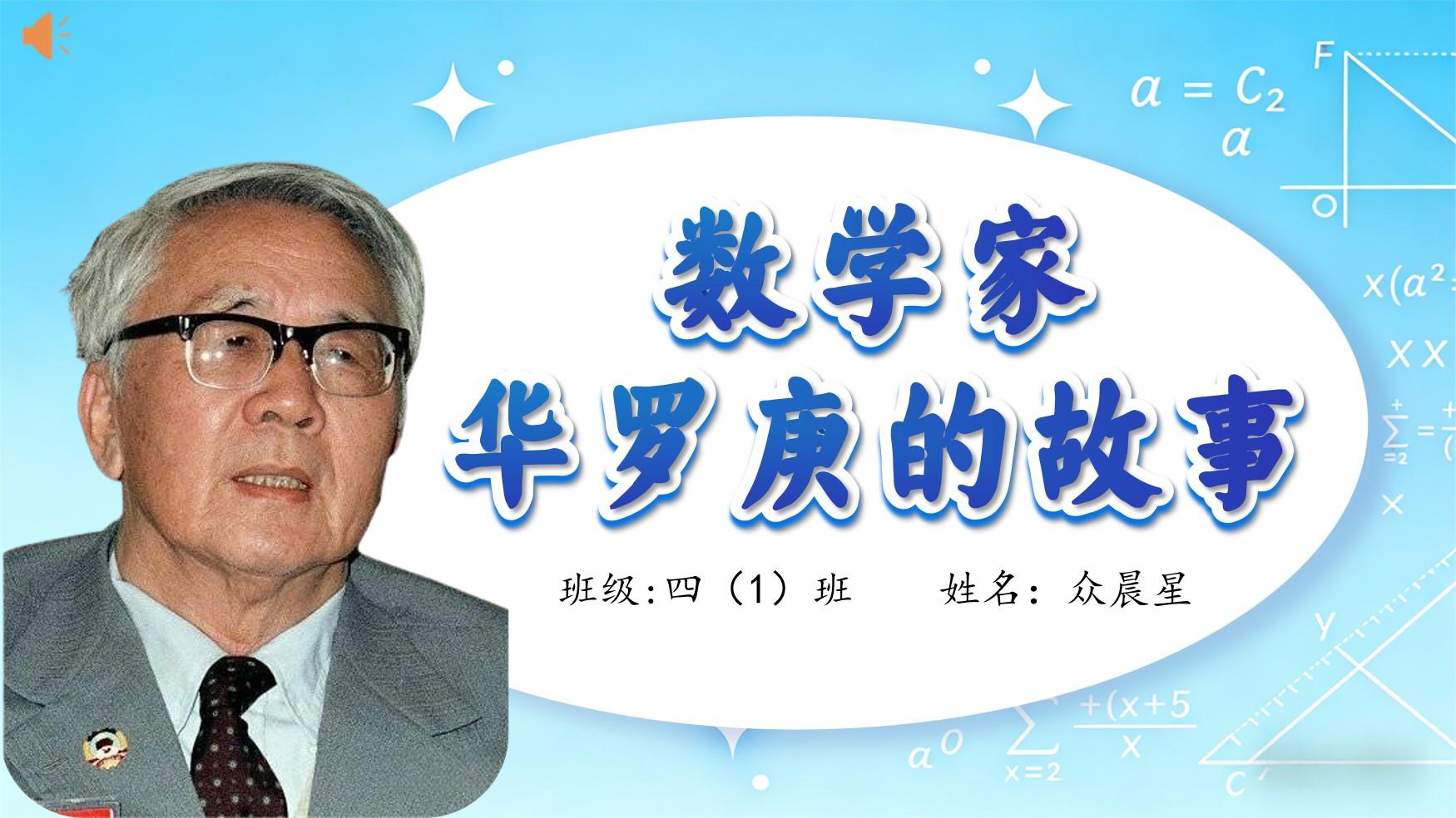我是四年级一班的众晨星,今天我分享的是一位超厉害的数学家——华罗庚。他是中国最了不起的数学家之一,用一生的努力,让全世界看到了中国数学的力量。