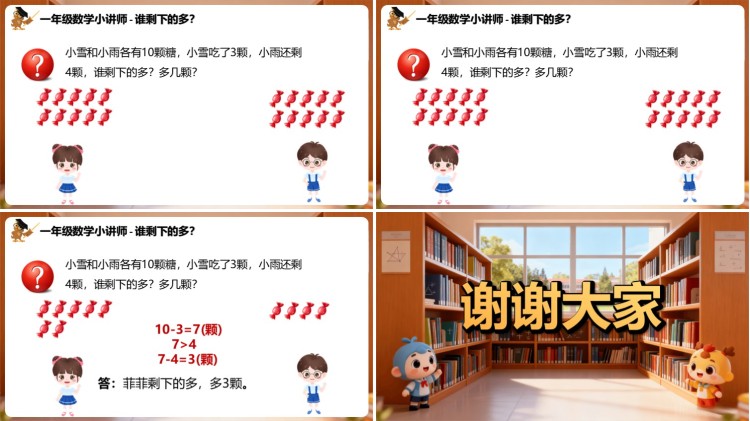 题目是这样的:小雪和小雨各有 10 颗糖,小雪吃了 3 颗,小雨还剩 4 颗,谁剩下的多?多几颗?