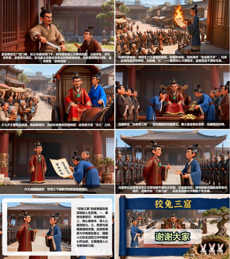 冯谖再劝孟尝君求齐王在薛地建齐国先王宗庙,宗庙建成后,薛地因象征国家而获重兵保护。冯谖告知“三窟已成”,此后孟尝君任齐相数十年无患。这则故事展现了冯谖的深谋远虑,也让“狡兔三窟”成为蕴含忧患意识的生存智慧。