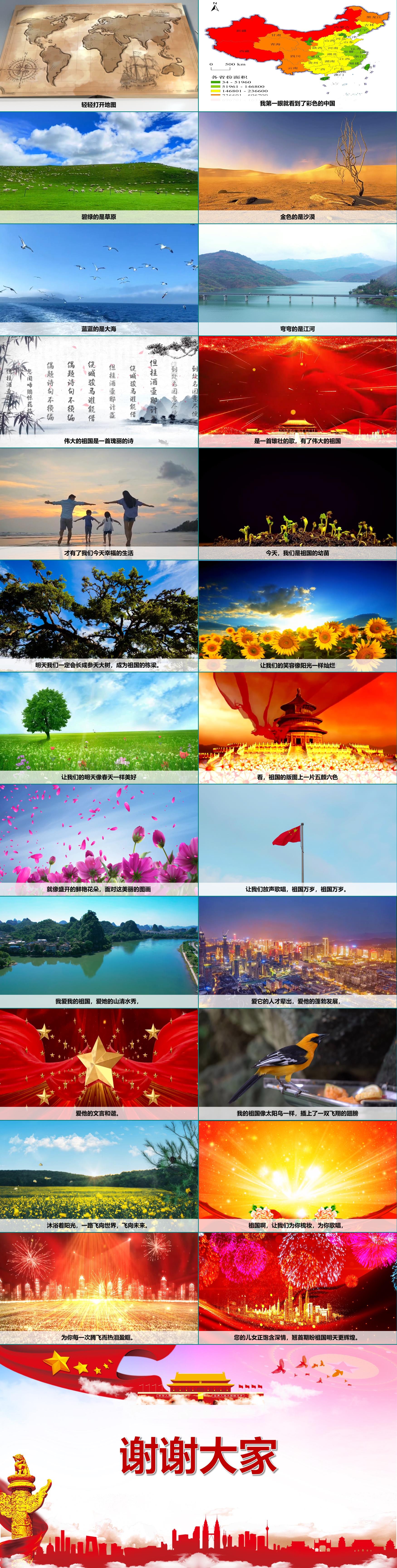 轻轻打开地图,我第一眼就看到了彩色的中国。碧绿的是草原,金色的是沙漠,蓝蓝的是大海,弯弯的是江河,伟大的祖国是一首瑰丽的诗,是一首雄壮的歌,有了伟大的祖国,才有了我们今天幸福的生活。今天,我们是祖国的幼苗,明天我们一定会长成参天大树,成为祖国的栋梁。让我们的笑容像阳光一样灿烂,让我们的明天像春天一样美好。看,祖国的版图上一片五颜六色,就像盛开的鲜艳花朵,面对这美丽的图画,让我们放声歌唱,祖国万岁,祖国万岁。我爱我的祖国,爱她的山清水秀,爱它的人才辈出,爱他的蓬勃发展,爱他的文言和谐。我的祖国像太阳鸟一样,插上了一双飞翔的翅膀,沐浴着阳光,一路飞向世界,飞向未来。祖国啊,让我们为你梳妆,为你歌唱,为你每一次腾飞而热泪盈眶。您的儿女正饱含深情,翘首期盼祖国明天更辉煌。