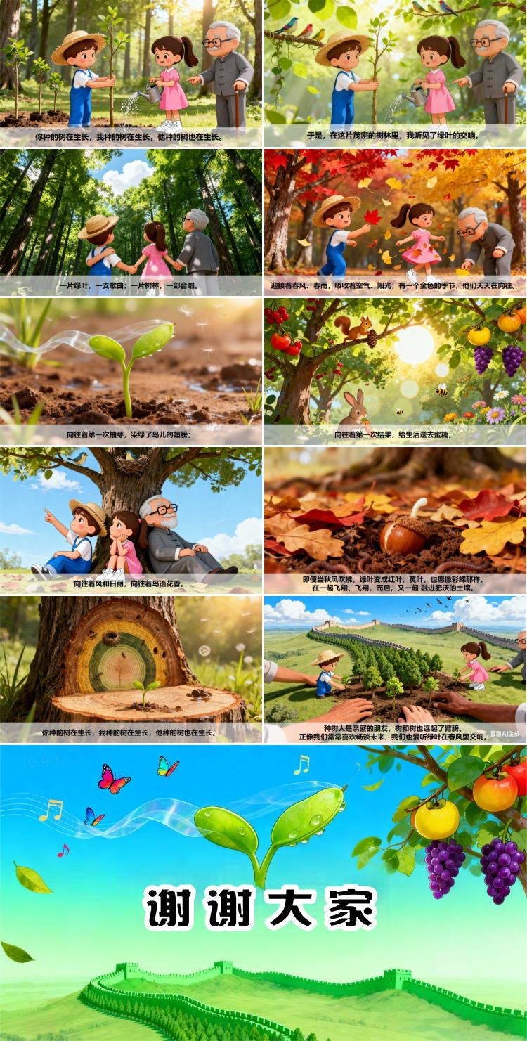 你种的树在生长,我种的树在生长,他种的树也在生长。种树人是亲密的朋友,树和树也连起了臂膀。