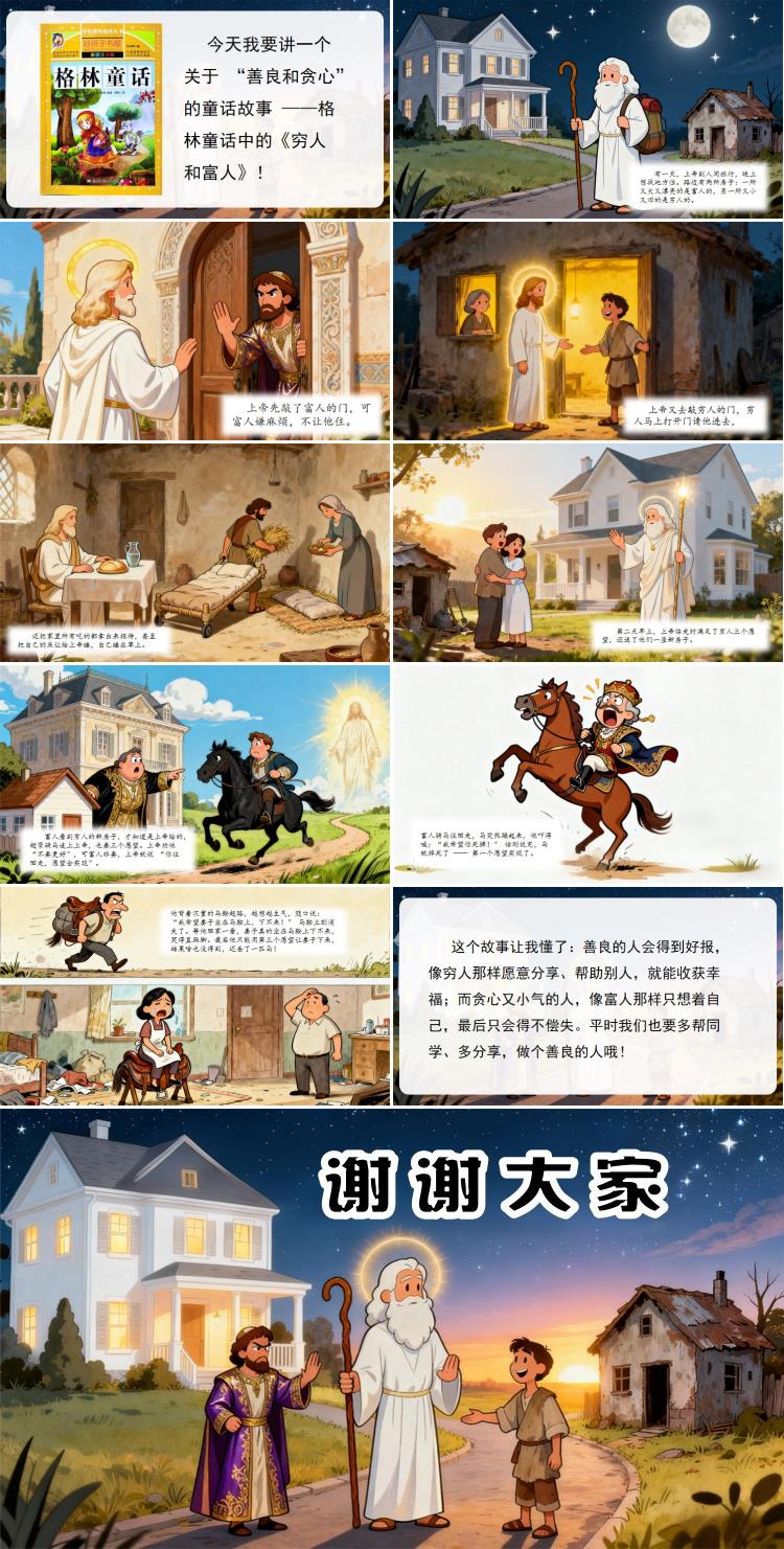 大家好!今天我要讲一个关于 “善良和贪心” 的童话故事 ——格林童话中的《穷人和富人》!