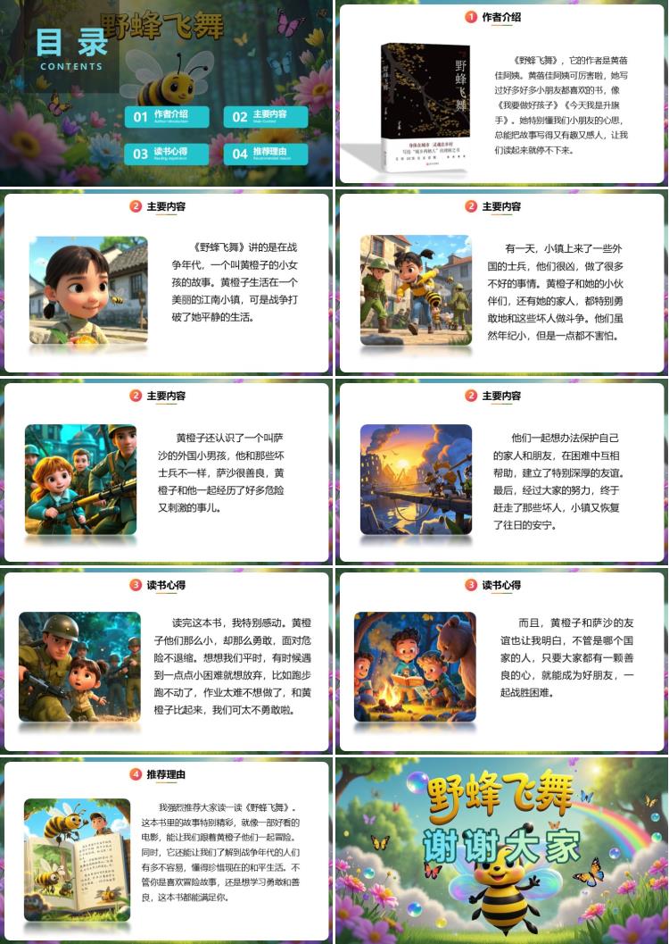 我强烈推荐大家读一读《野蜂飞舞》。这本书里的故事特别精彩,就像一部好看的电影,能让我们跟着黄橙子他们一起冒险。同时,它还能让我们了解到战争年代的人们有多不容易,懂得珍惜现在的和平生活。不管你是喜欢冒险故事,还是想学习勇敢和善良,这本书都能满足你。