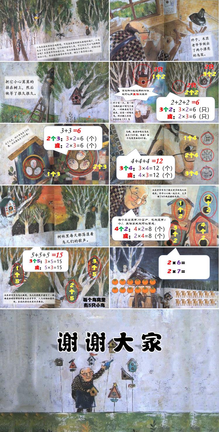 终于有一天,有一对乌鸦吹着口哨飞了进来,一对麻雀也飞了进来,还有一对啄木鸟,所以树上共有2+2+2=6(只)鸟,这里的加数都是2,有三个2相加,得数是6,像这种加数相同的加法,就可以用乘法来表示,这里的两只鸟就可以说是1个2,那么这里就有2个2 , 3个2,像这样3个2,我们就可以写成乘法算式,3×2=6(只)或者2×3=6(只),中间的符号就是我们的新朋友乘号啦!6只鸟儿欢快极了,木匠老爷爷别提有多高兴啦!
